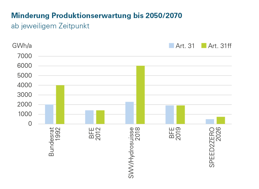Im Abstimmungsbüchlein zur Volksabstimmung über das GSchG wurde 1992 erläutert, dass die Mindestrestwassermengen gemäss Art. 31 die damalige Wasserkraftproduktion bis 2070 um knapp 6 % – das wären rund 2000 GWh pro Jahr – reduzieren würden. Zusätzlich wurde eine weitere Produktionsminderung «in der gleichen Grössenordnung» vermutet als Folge der Interessensabwägungen gemäss Artikel 33. Zusammengenommen rechneten Parlament und Volk also mit einer Minderung von rund 4000 Gigawattstunden pro Jahr oder 12 % der damaligen Produktionserwartung. Die nun berechneten Prognosen bis 2050 zeigen: Die Minderung aufgrund der schematisch festgelegten Mindestabflüsse aus Art. 31 beträgt rund 1600 GWh/a, liegt also im Bereich der vor 35 Jahren geschätzten Zahl. Die Prognose, wegen Erhöhungen der Restwassermengen gingen nochmals 2000 GWh/a verloren, erweist sich indes als falsch. Auch die Befürchtung, die anstehenden Neukonzessionierungen würden ab heute bis 2050 zu einer besonders hohen Minderung der Produktionserwartung führen, wird durch die Simulation relativiert: Diese Grösse liegt zwischen 484 und 725 GWh. Das sind weniger als 2 % der Produktionserwartung von 2050. Schliesslich gilt es auch zu berücksichtigten, dass die Schweizer Wasserkraftproduktion seit 1992 durch Neu- und Ausbauten und technische Verbesserungen um über 4000 GWh gesteigert wurde.